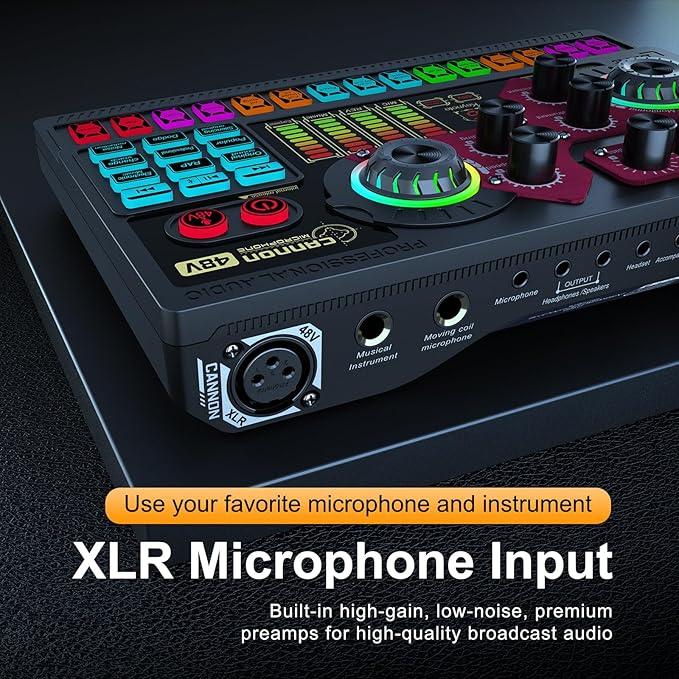 - 【XLR Mic Input】One XLR microphone input interface is set on the X5 audio mixer, which is great to up your audio quality with your XLR setup. The XLR mixer is a stepping stone to upgrade your live streaming. Audio mixer offered built-in 48V phantom power which opens up more choices for mics. (NOT available for USB mic) Moreover, X5 also supports the simultaneous inputs of a 6.35mm dynamic mic, 3.5mm mic, and headset mic, achieving multi-person input.