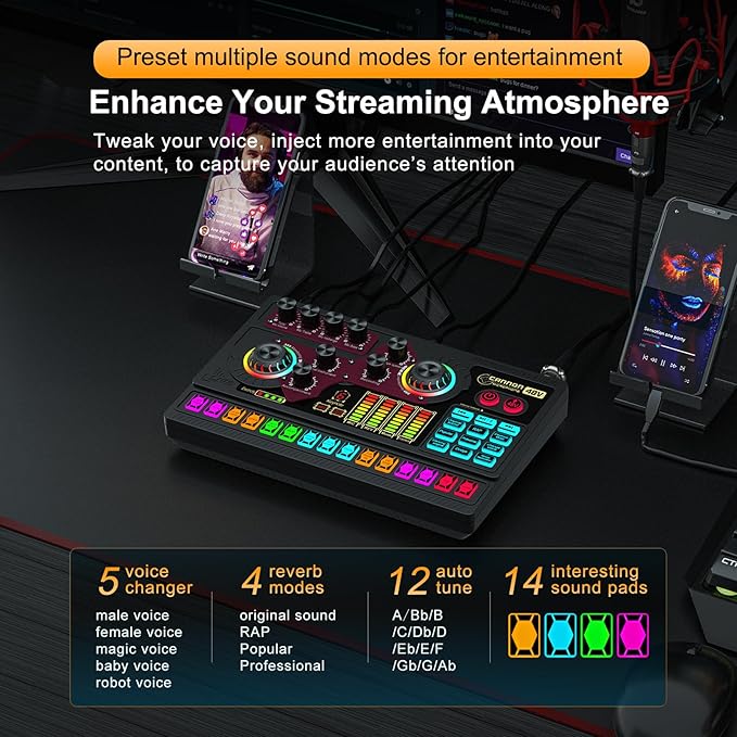 - 【Design for live streaming】In order to improve the live streaming effect for beginners, we have built-in four practical functions. 12 step auto une, 5 Voice Changer, 4 reverb modes and 14 Sound effects variety of warm-up sound effects are used toease the atmosphere and attract moreviewers during live broadcasts.