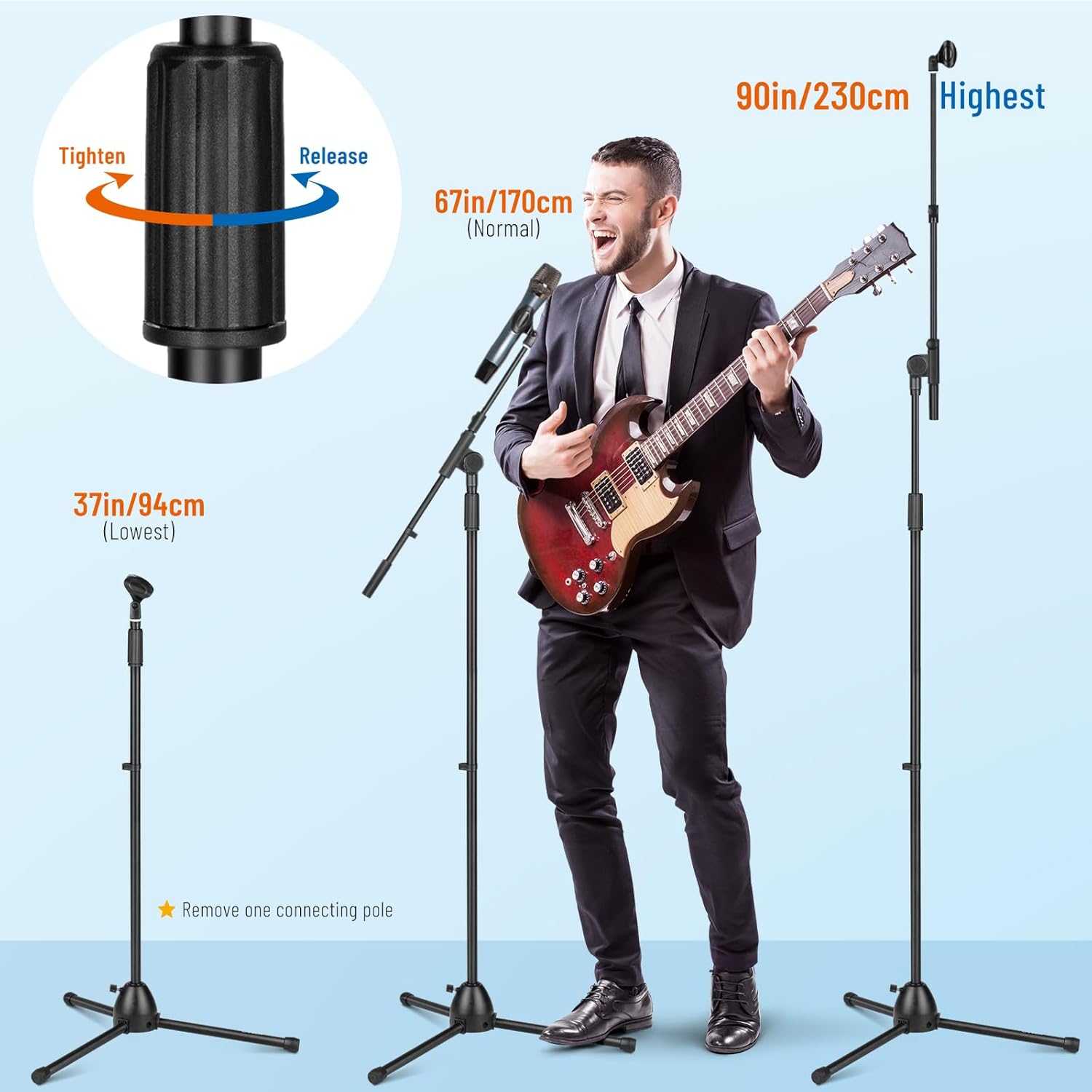 The height of the mic stand is easily adjustable, allowing you to customize it to your preferred height for singing, wedding ceremonies, or any other performance. The sturdy tripod base ensures stability and support, even when using heavier microphones or equipment.